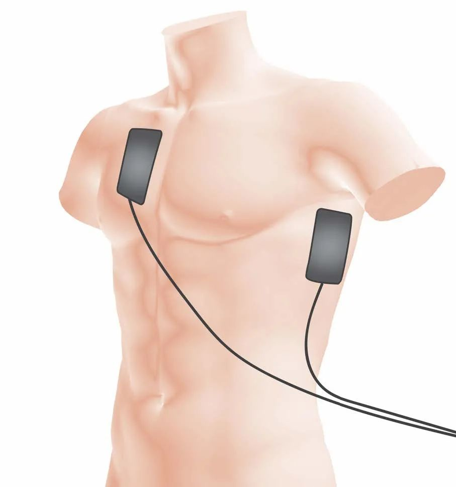 ERC在2021版指南中给出了AED电极片最佳的贴放位置,指南推荐将电极片置于常规的前–外侧位置(胸骨—心尖),右(胸骨)电极片位于锁骨下方、胸骨的右侧,心尖部位电极片是置于左腋中线,大约与V6ECG电极齐平。(心电图v6导联为左侧腋中线和第5肋间交叉点)这个位置应该没有任何乳腺组织。重要的是,该电极片要充分纵向放置在侧面。