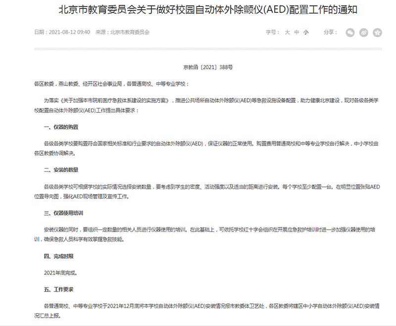 据报道,截止2022年1月21日北京市大中小学校及中等专业学校共配有AED 1900余台,已实现全市各级各类学校全覆盖。从2021年8月北京教委发布《关于做好校园自动体外除颤仪(AED)配置工作的通知》以来,北京高校仅用了不到半年的时间就实现AED全市各级各类学校全覆盖。