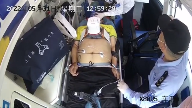 12点58分,患者被转移至救护车上,工作人员仅用时5分钟,将患者安全转送至临平区第一人民医院急诊进一步抢救。