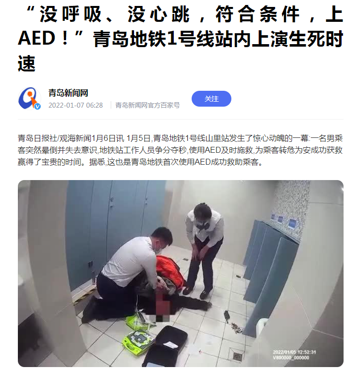 这已不是青岛地铁AED第一次救人。早在今年1月,青岛1号线山里站两名站务人员,紧急启用AED,40秒“抢”回呼吸和心跳暂停的倒地乘客,保障了乘客的生命安全。