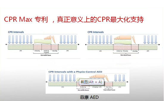 菲康AED的独特在于它的专利技术“CPR Max”,它在进行“分析”的时候要停止人工按压,进入“充电”过程的这段时间则允许继续人工对心脏进行按压施救,从而不影响AED的正常运行,当除颤仪提示“放电”的时候则AED正式进入抢救!这个环节缩减了从分析到放电消耗的(用于人工按压)时间环节,为急救者争取了宝贵的黄金时段!此举科学,有效,大大提高了抢救效率。救人如救火,刻不容缓,容不得半点马虎和差错。