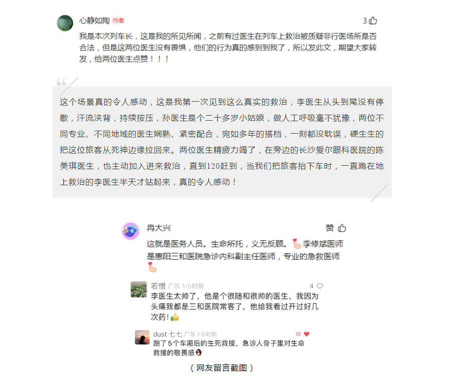 2024年5月21日 G1021次列车刚刚到达广州南站 很多旅客还没来得及放好行李 就听到广播里传来求助的声音 7-8号车厢连接处 有一位65岁左右的男性旅客发生急病 突然晕倒,需要医生救治 带着医护人员责任感 深圳大鹏新区南澳人民医院孙雨晴医生 14车厢的惠州市惠阳三和医院的李修斌医生 先后赶到了事发车厢 此时,旅客脸色发乌,呼吸渐弱 必须立即实施心肺复苏 这趟列车的列车长目睹了整个经过,备受感动,事后他在自己的个人账号上描述了整个事情经过,他深情地写道……