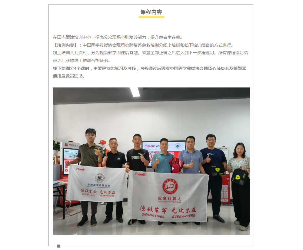 【培训方式】:线下理论学习+实操演练 【考核方式】:笔试答卷+实操考核 【培训费用】:中国医学救援协会培训为全国统一定价599元/人。含线上学习、线下技能练习及考核,教具使用费、导师费等。 【培训福利】:茶歇 【招生对象】:对急救、健康有相关需求的人群均可报名。 【资格证书】: ▲ 培训并通过考核后出证,证书由中国医学救援协会统一邮寄; ▲ 证书有效期:3年; ▲ 证书国内通用;