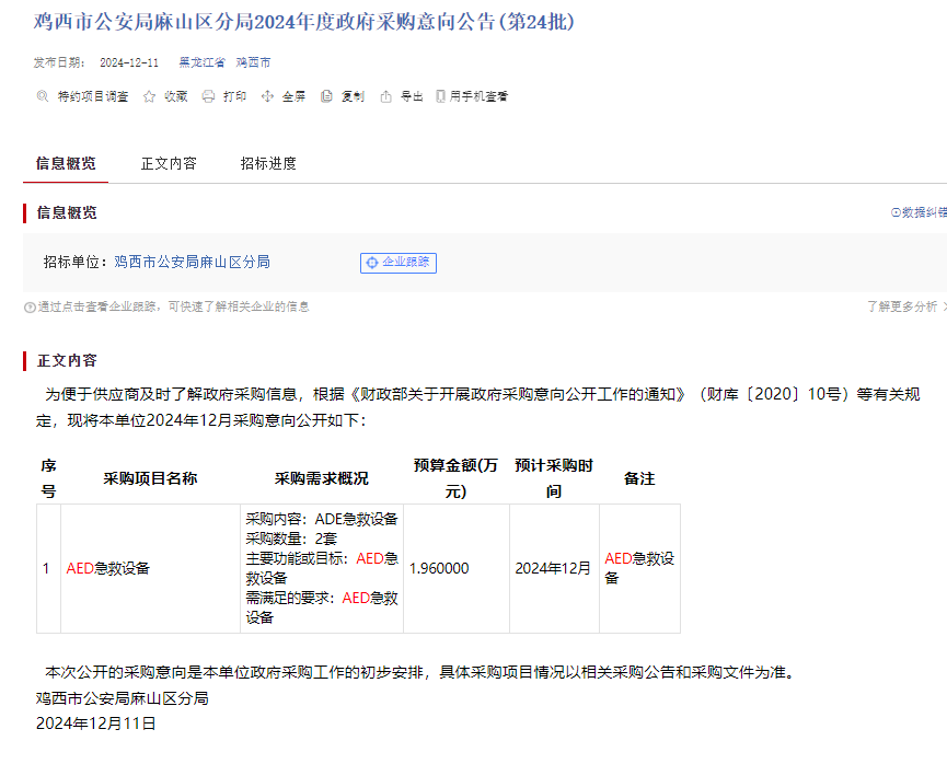 AED最新投标信息:鸡西市公安局麻山区分局2024年度政府采购意向公共(第24批)