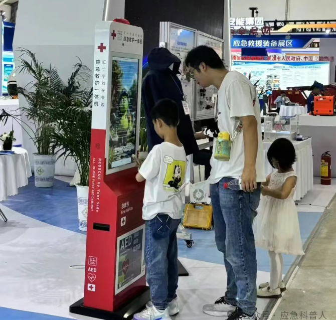 品瑞急救长期致力于公共场所急救设备经营、应急救护一体机,智慧急救站等研发,作为美国心脏协会 AHA HS 及中国医学救援协会 CPR - D 心肺复苏急救员合作培训基地,有着深厚的行业积累。此次参展的 AI 智慧应急救护一体机,集多种先进功能于一体。在智慧教学方面,它能够为参观者提供系统且专业的应急救护知识讲解。无论是心肺复苏的正确操作步骤,还是 AED(自动体外除颤仪)的使用方法,一体机都能通过生动的动画演示、清晰的语音提示,将复杂的急救知识直观地呈现出来。例如在讲解心肺复苏时,屏幕上会精准展示按压位置、频率以及深度等关键要点,让学习者能够快速掌握核心技巧。
