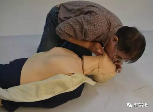施救者立即用食指中指捏住患者鼻孔,张开嘴将患者口完全包住,缓慢地将气体吹入患者口内。每次吹气应为一秒,但避免过度用力吹气。吹气时用余光观察患者呼吸情况,吹气量以胸廓起伏为准,然后放开患者口鼻,使气流顺畅排出。需要注意的是,做心肺复苏时,胸外心脏按压按压:口对口吹气=30:2,即每进行30次按压后,做2次口对口吹气,即为一组心肺复苏操作。